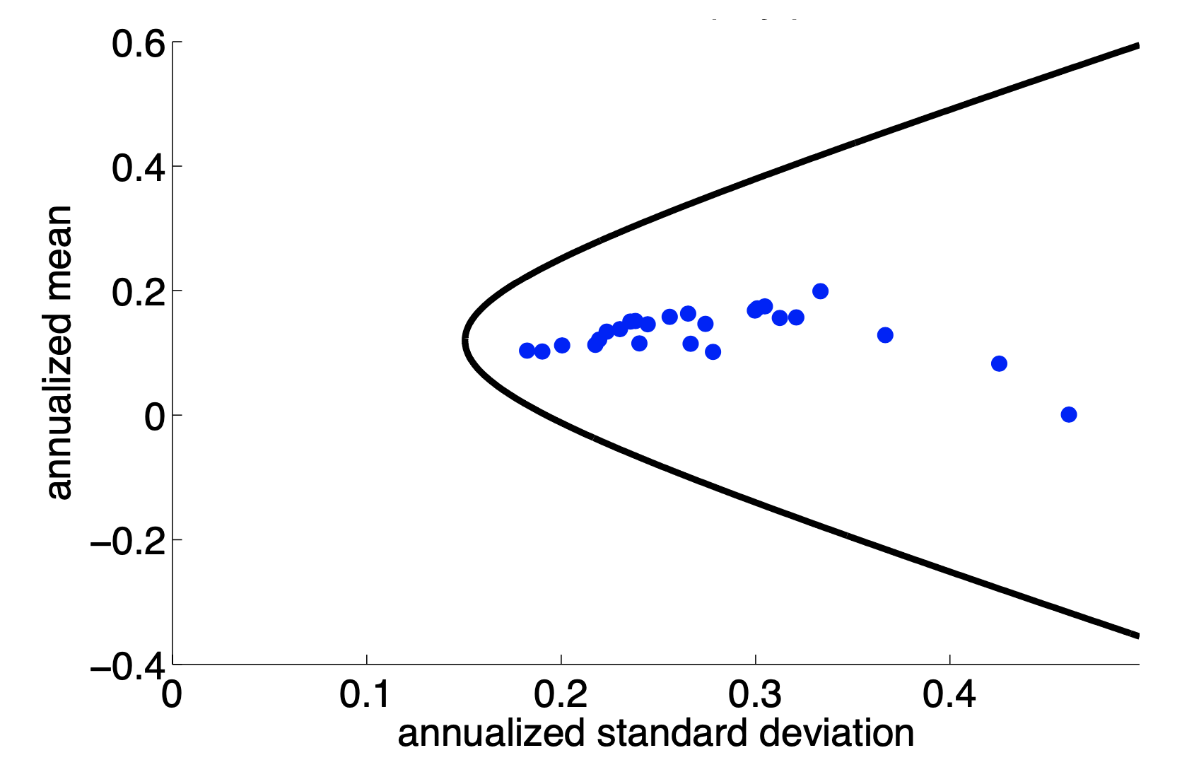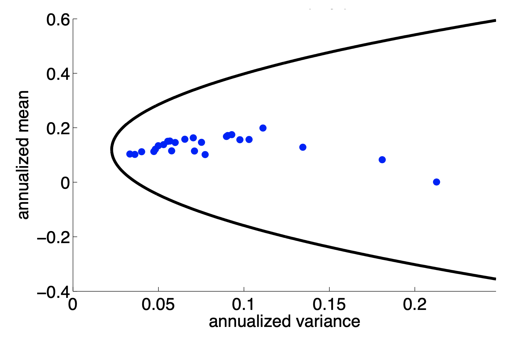 A mean-variance portfolio is a vector, \(\wtvec^*\) which solves the following constrained optimization for some mean excess return target \(m\).