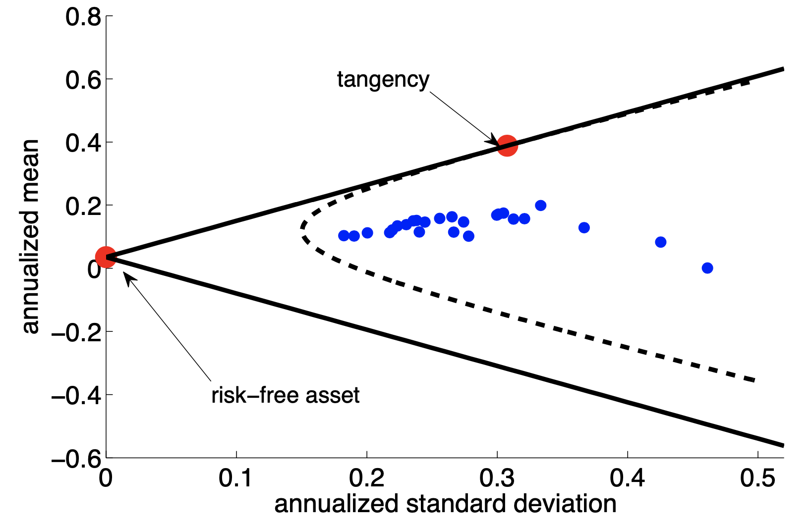 Variation in investor risk will lead to different solutions, but even with \(\Nsec\) assets, everyone holds the exact same bundle, (the tangency portfolio,) in different sizes.