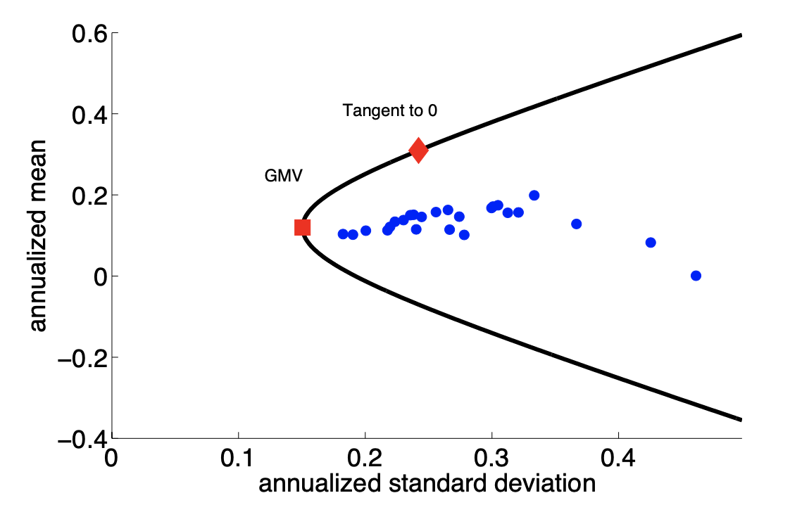 Takes some tedious algebra, but can be shown that the tangency weights, (solving the MV problem) are obtained by the following, (weird!) regression: